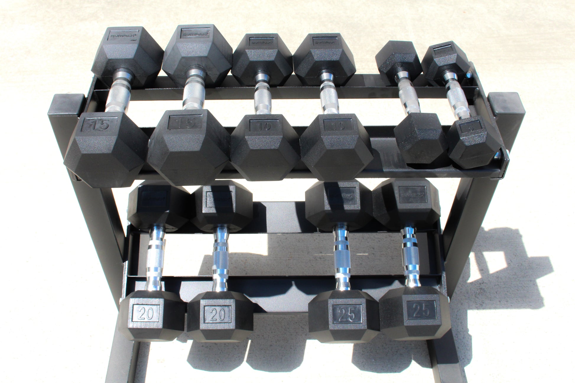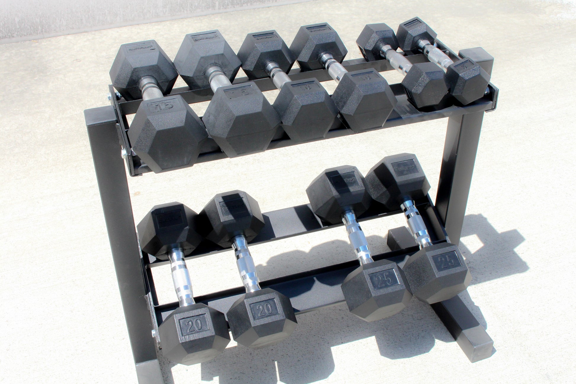 Rubber Hex Dumbbell Set - 5 - 25 LB - 5 Pairs with Rack